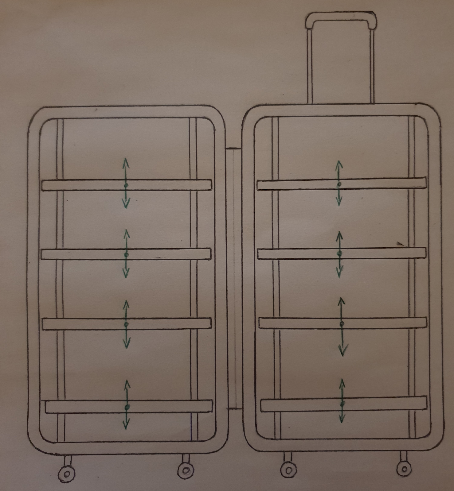 Les différents étages de la valise étagère peuvent coulisser via un système, l'utilisateur peut ainsi définir la taille des compartiments. Les étages supérieurs «écrasent» les inférieurs afin de limiter le froissement des vêtements.